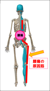 腰痛の原因筋はズバリ外側筋です!上の図の赤いライン、ここのライン上で強ばっている箇所やしこりのように硬くなっている箇所があるとそこが腰痛の引き金となっているケースが大多数です。